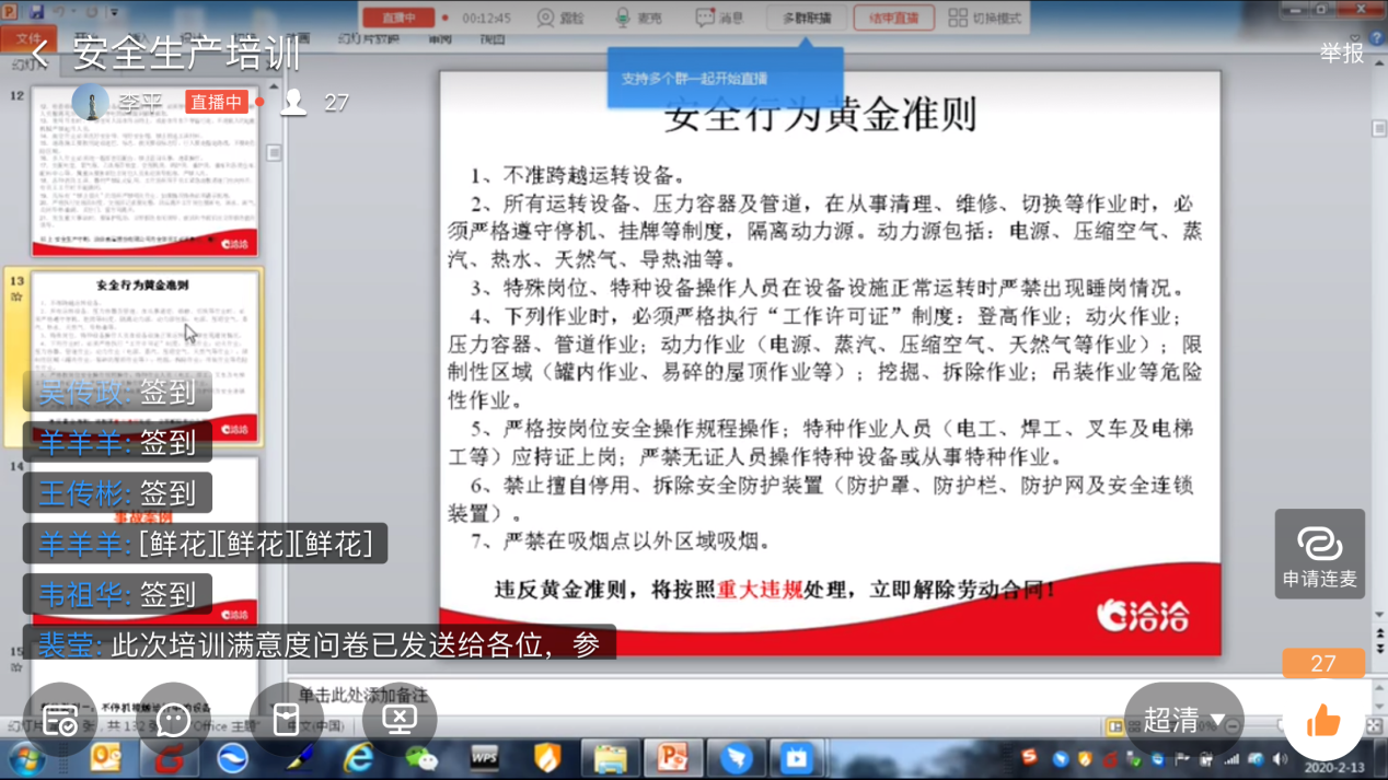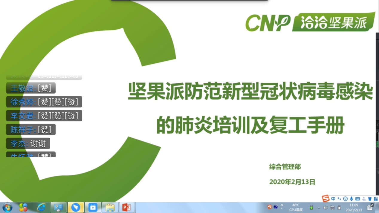 2月13日,目前全國(guó)抗擊疫情進(jìn)入關(guān)鍵時(shí)期,堅(jiān)果派也不忘使命、加緊步伐,利用釘釘網(wǎng)絡(luò)直播平臺(tái)分別開(kāi)展了全員《安全生產(chǎn)管理培訓(xùn)》及《防范新型冠狀病毒培訓(xùn)》,調(diào)整員工工作狀態(tài),保證組織安全、健康、平穩(wěn)的運(yùn)行。